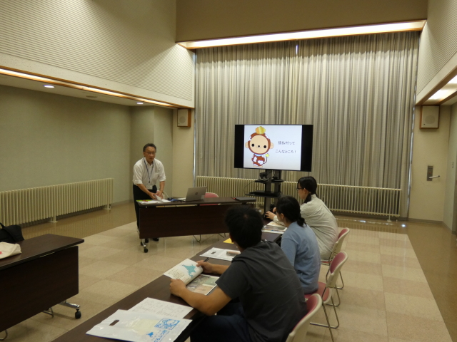 猿払村役場内で猿払イトウ保全協議会会長、小山内より、協議会発足、猿払イトウの会の活動、役場産業課、阿部課長より猿払村の産業、概要の講義受け初日を終了