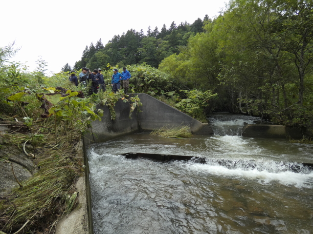 2日目午前は大雨の影響で猿払川沿いの道路が冠水で通行止めとなり、急遽、王子HD社有林内を流れる猿骨川上流部の河川環境やイトウの生息にとって脅威となる個所などを猿払イトウの会川原が現地を廻り説明、河川改修後の河畔林等、人の手が加えられた部分の違いや湿地、山地の植生の違い、イトウの産卵河川を歩きカラフトマスの産卵、河川環境や河畔林、倒木と自然河川の構造、イトウを含む魚類の遡上障壁となる河川工作物を観察しました